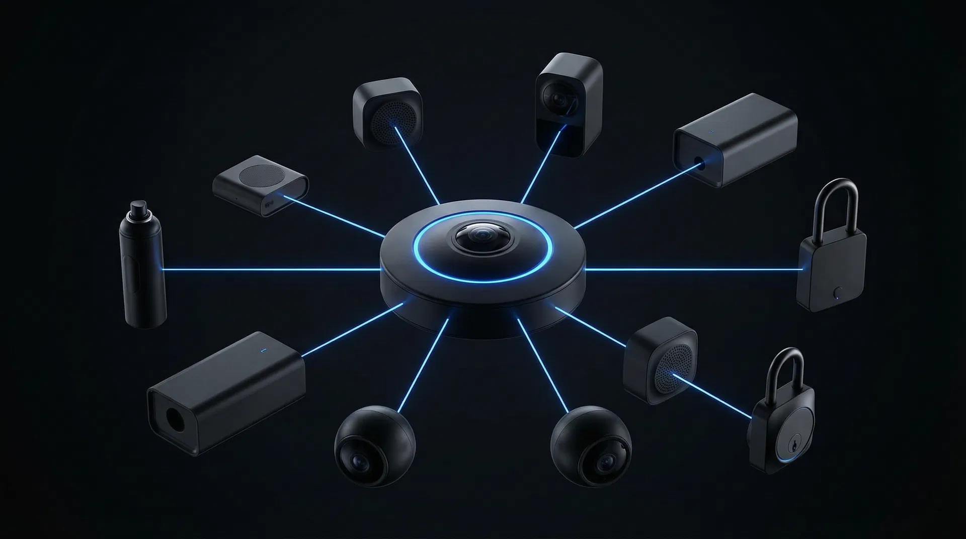 First active defense platform with camera as command center and 10 types of modular defense weapons. Owner controls everything — legally, adaptively, globally.
